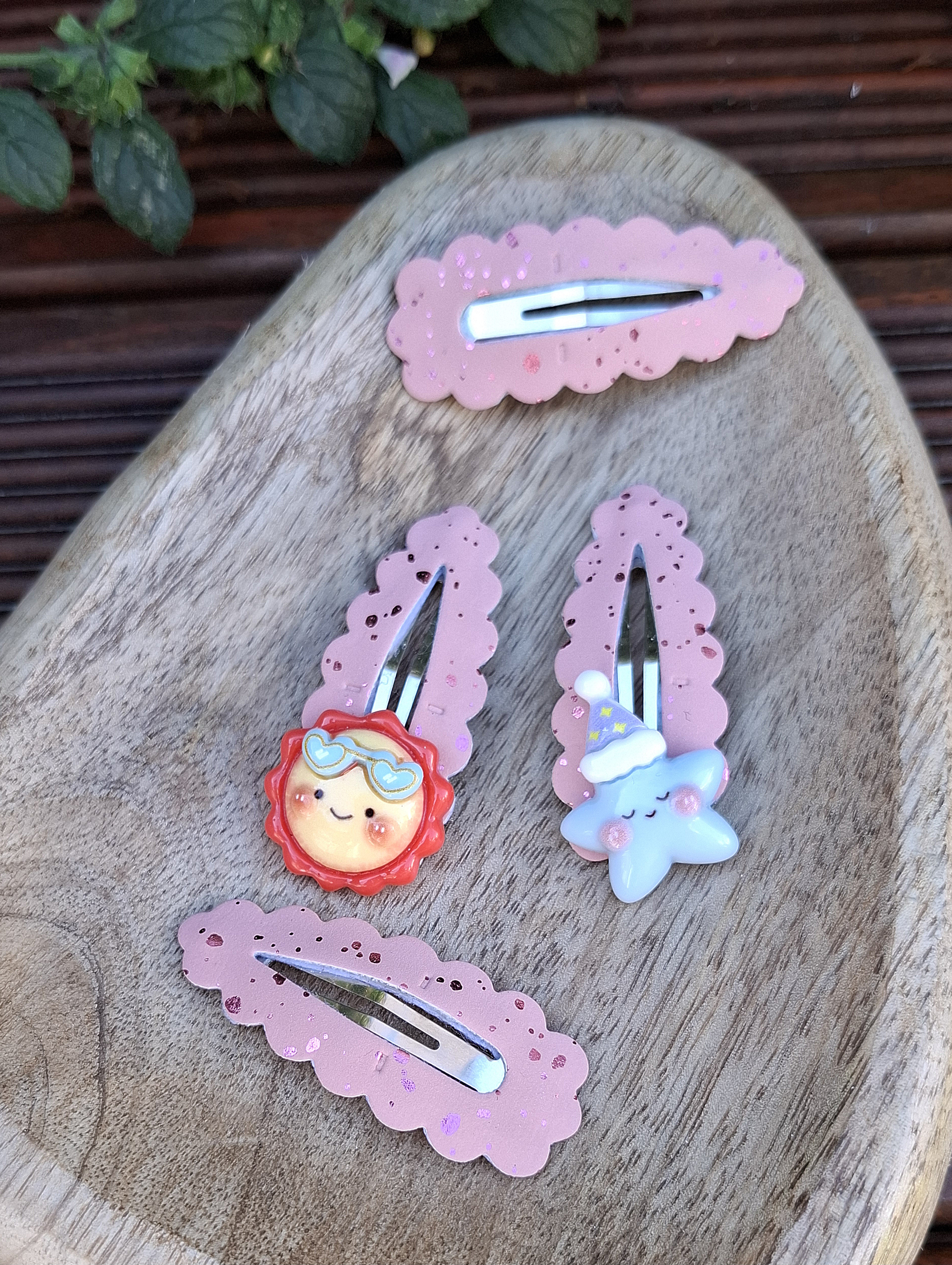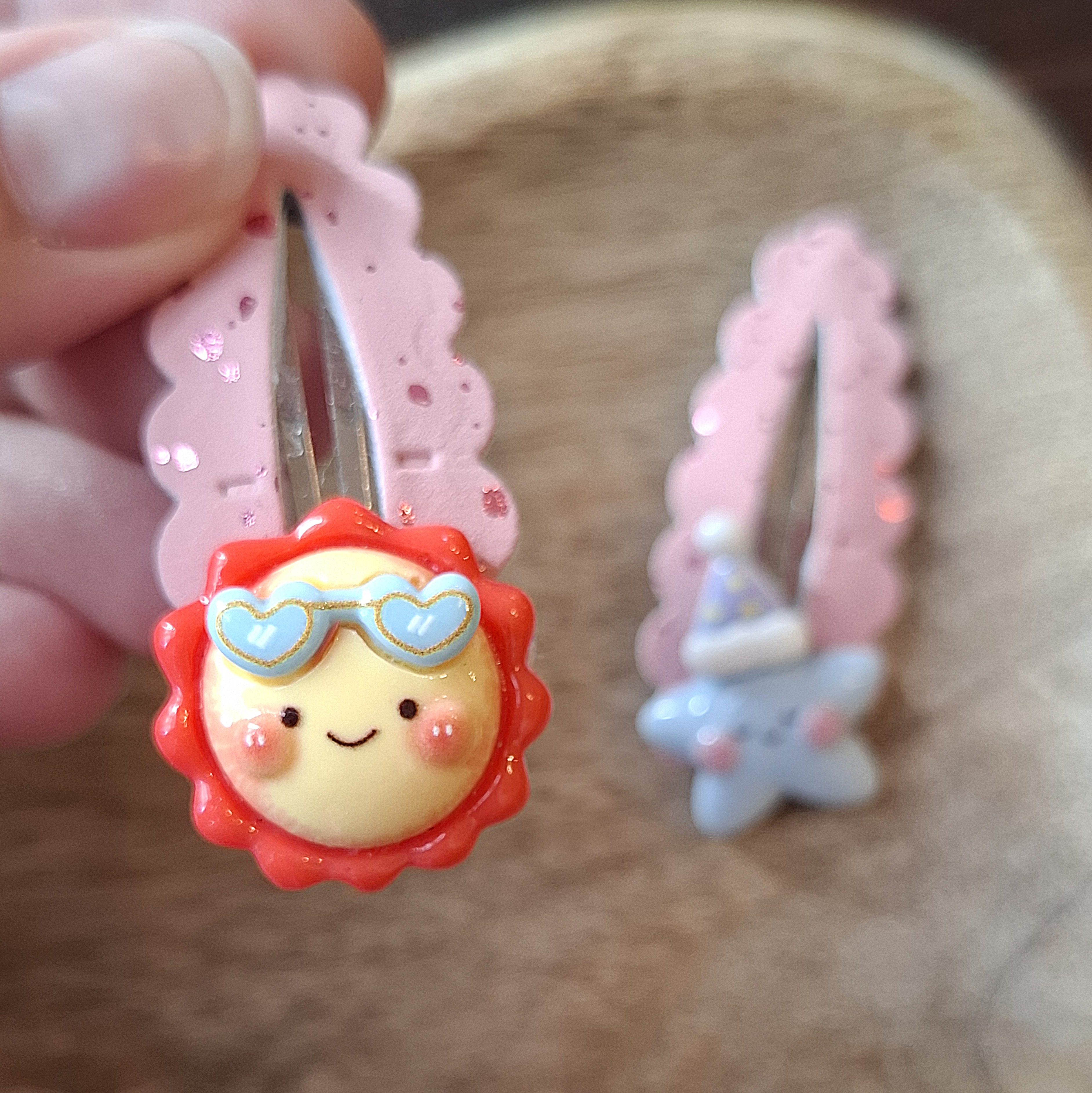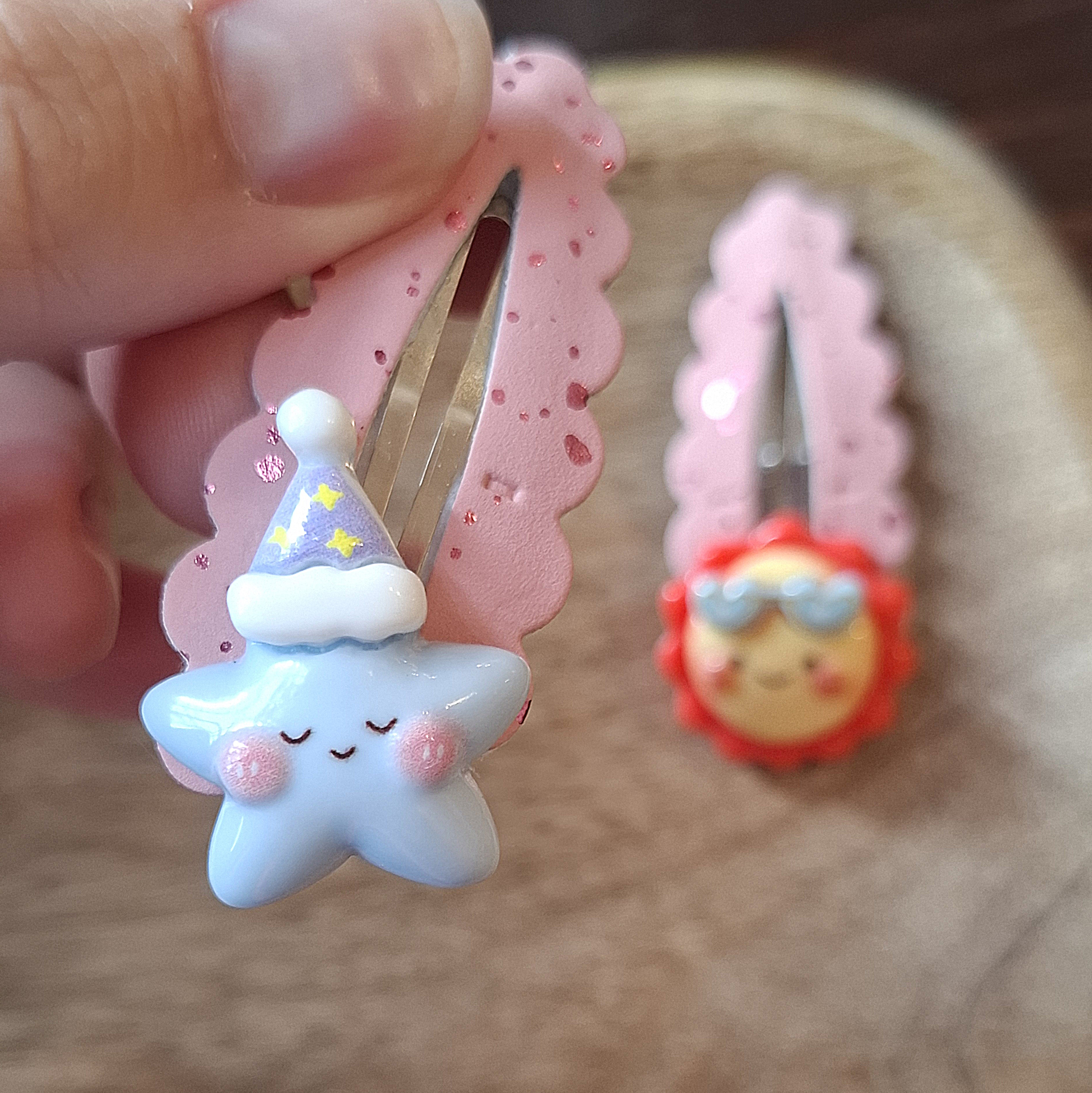 Veselé růžové sponky se sluníčkem a hvězdičkou 🌞⭐ které pevně drží i jemné vlásky. Díky třpytivému růžovému podkladu a hravým motivům jsou ideální do školky, na oslavy i na každý den.